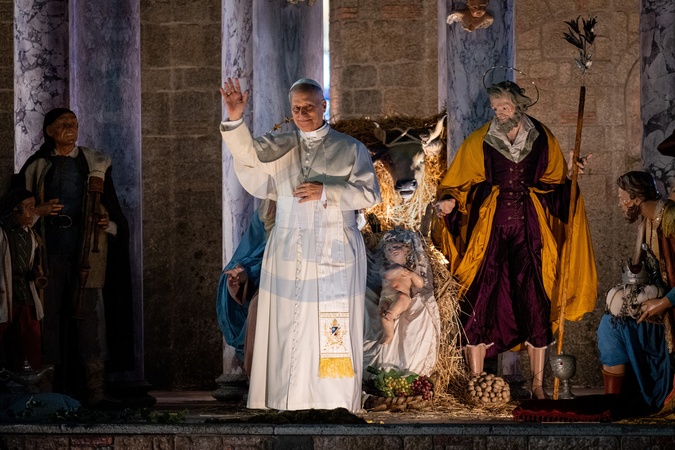 Pope Leo XIV stops for a moment of prayer in front of the nativity scene that adorns St. Peter's Square in Vatican City, Vatican on 31 December 2025.