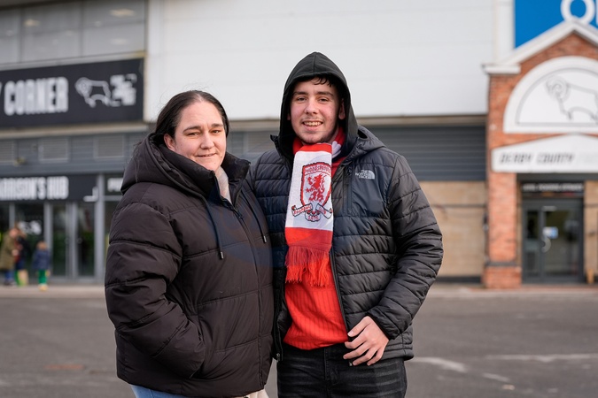 Middlesborough travelling away fans arrive prior to kick off during the Sky Bet Championship match Derby County vs Middlesbrough at Pride Park Stadium, Derby, United Kingdom, 1st January 2026, Credit:Maynard Manyowa/News Images / Avalon