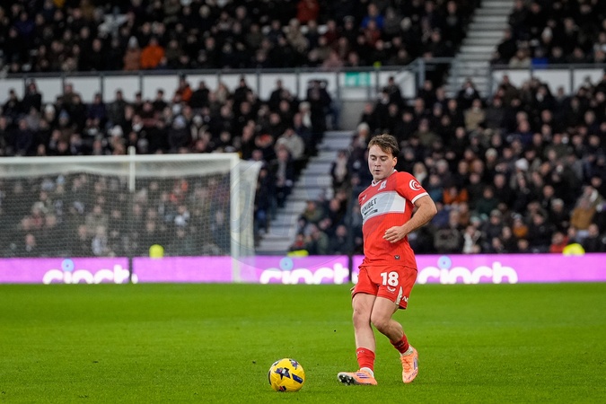 Aidan Morris of Middlesbrough passes the ball during the Sky Bet Championship match Derby County vs Middlesbrough at Pride Park Stadium, Derby, United Kingdom, 1st January 2026, Credit:Maynard Manyowa/News Images / Avalon