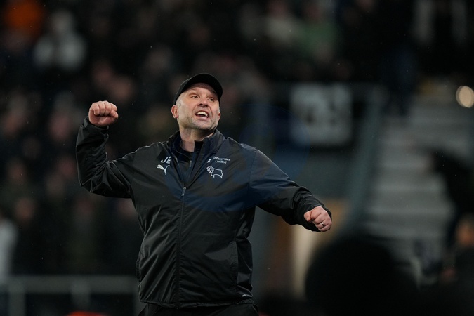 John Eustace manager of Derby County celebrates his team scoring a goal to make it during the Sky Bet Championship match Derby County vs Middlesbrough at Pride Park Stadium, Derby, United Kingdom, 1st January 2026, Credit:Maynard Manyowa/News Images / Avalon