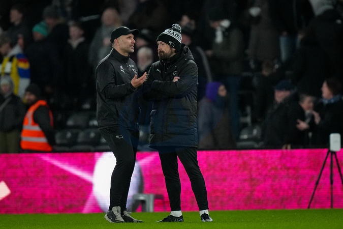 John Eustace manager of Derby County speaks with a member of his coaching staff at full time during the Sky Bet Championship match Derby County vs Middlesbrough at Pride Park Stadium, Derby, United Kingdom, 1st January 2026, Credit:Maynard Manyowa/News Images / Avalon