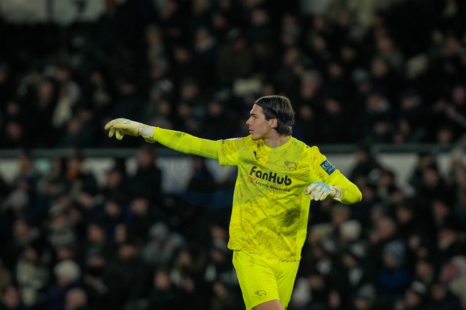 Derby County goalkeeper Jacob Widell Zetterstrom at full time during the Sky Bet Championship match Derby County vs Middlesbrough at Pride Park Stadium, Derby, United Kingdom, 1st January 2026, Credit:Maynard Manyowa/News Images / Avalon