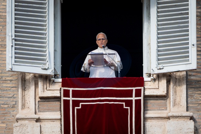 Pope Leo XIV delivers his blessing as he recites the Angelus noon prayer from the window of his studio overlooking St. Peter's Square in Vatican City, Vatican, on 01 January 2026.