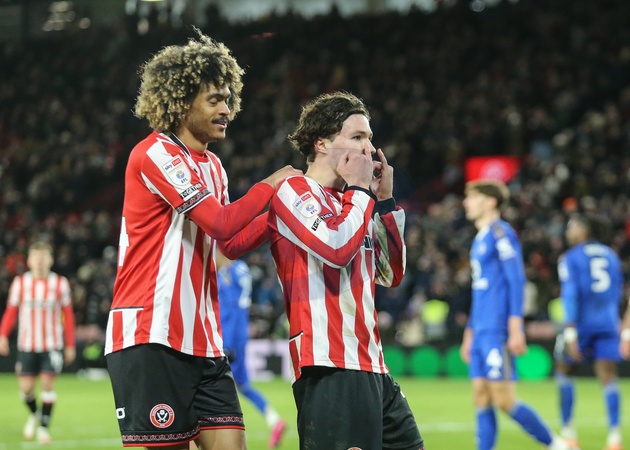 Callum O'Hare of Sheffield United celebrates his goal to make it 3-0 during the Sky Bet Championship match Sheffield United vs Leicester City at Bramall Lane, Sheffield, United Kingdom, 1st January 2026, Credit:Richard Bierton/News Images / Avalon