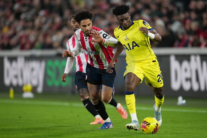 Mohammed Kudus of Tottenham Hotspur and Kevin Schade of Brentford battle during the Premier League match Brentford vs Tottenham Hotspur at The Gtech Community Stadium, London, United Kingdom, 1st January 2026, Credit:Harvey Murphy/News Images / Avalon