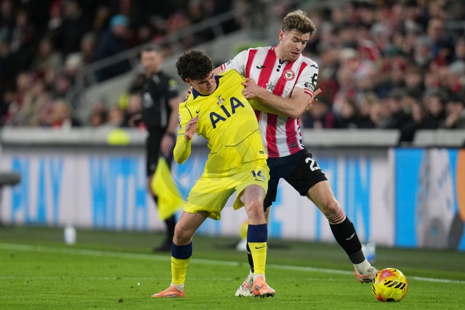 Nathan Collins of Brentford battles Archie Gray of Tottenham Hotspur for the ball during the Premier League match Brentford vs Tottenham Hotspur at The Gtech Community Stadium, London, United Kingdom, 1st January 2026, Credit:Harvey Murphy/News Images / Avalon