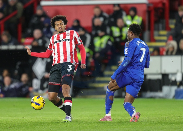 Sam McCallum of Sheffield United passes the ball during the Sky Bet Championship match Sheffield United vs Leicester City at Bramall Lane, Sheffield, United Kingdom, 1st January 2026, Credit:Richard Bierton/News Images / Avalon