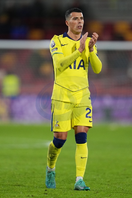 Pedro Porro of Tottenham Hotspur applauds away support during the Premier League match Brentford vs Tottenham Hotspur at The Gtech Community Stadium, London, United Kingdom, 1st January 2026, Credit:Harvey Murphy/News Images / Avalon