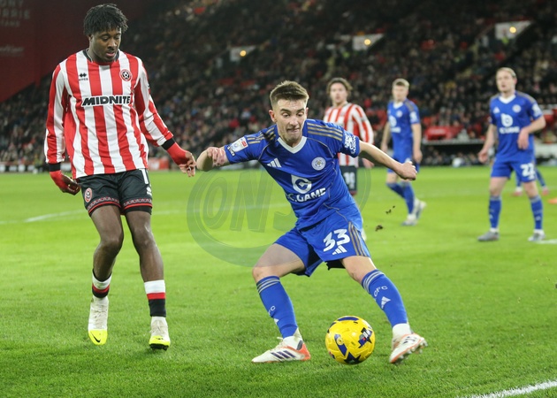 Luke Thomas of Leicester City clears the ball up field during the Sky Bet Championship match Sheffield United vs Leicester City at Bramall Lane, Sheffield, United Kingdom, 1st January 2026, Credit:Richard Bierton/News Images / Avalon
