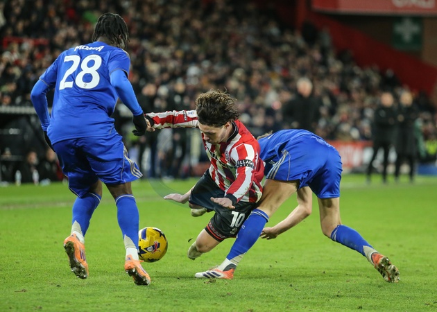 Callum O'Hare of Sheffield United is tackled by Luke Thomas of Leicester City during the Sky Bet Championship match Sheffield United vs Leicester City at Bramall Lane, Sheffield, United Kingdom, 1st January 2026, Credit:Richard Bierton/News Images / Avalon