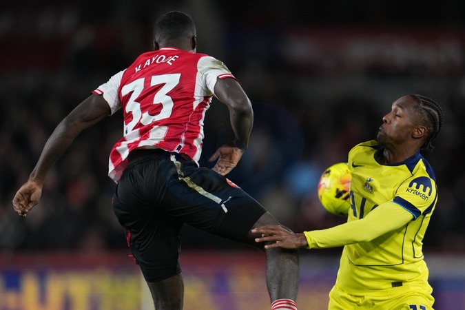 Mathys Tel of Tottenham Hotspur and Michael Kayode of Brentford during the Premier League match Brentford vs Tottenham Hotspur at The Gtech Community Stadium, London, United Kingdom, 1st January 2026, Credit:Harvey Murphy/News Images / Avalon