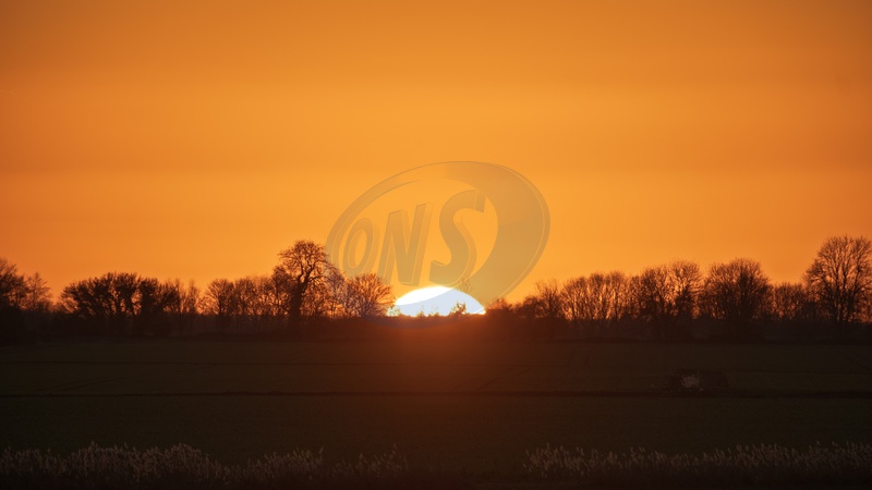 Setting sun in the fens near Ely, Cambridgeshire, UK.