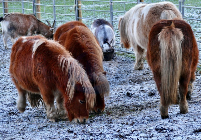 Miniature ponies and pygmy goats graze on a frosty, cold morning in the countryside., Credit:Geoffrey Swaine / Avalon