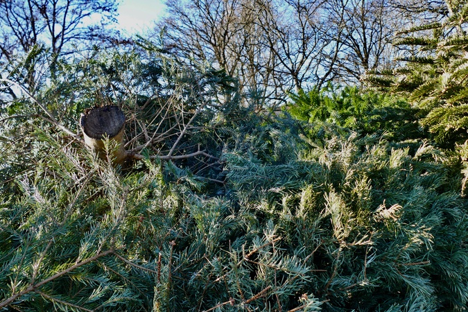 Discarded Christmas tree piled up at a local nature reserve waiting for the council to collect them and mulch them. The UK disposes of around 6 to 8 million real Christmas trees annually, with efforts focused on recycling these into compost or woodchip, preventing them from ending up in landfills, which can cost taxpayers millions and harm the environment. Many local councils and charities run schemes to collect and recycle these trees, turning them into mulch for parks or fuel, but a significant portion still goes to landfill if not collected., Credit:Geoffrey Swaine / Avalon