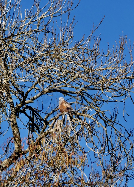 A Red Kite (milvus milvus) perches high up in a tree against the clear blue skies., Credit:Geoffrey Swaine / Avalon