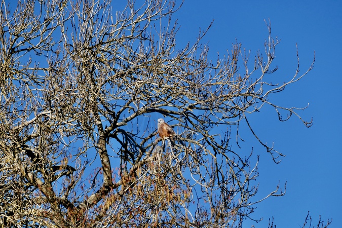 A Red Kite (milvus milvus) perches high up in a tree against the clear blue skies., Credit:Geoffrey Swaine / Avalon