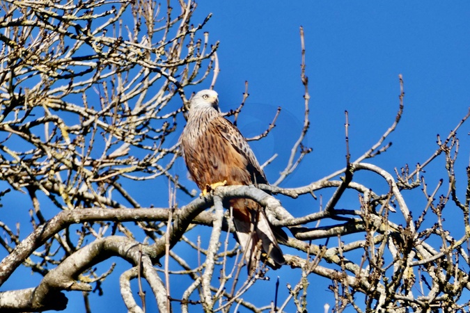 A Red Kite (milvus milvus) perches high up in a tree against the clear blue skies., Credit:Geoffrey Swaine / Avalon