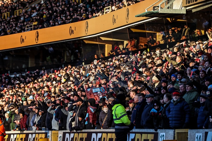 West Ham fans protest during the Premier League match Wolverhampton Wanderers vs West Ham United at Molineux, Wolverhampton, United Kingdom, 3rd January 2026, Credit:Ae Cosgrove/News Images / Avalon
