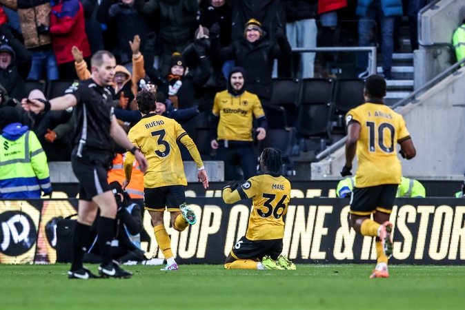 Mateus Mane of Wolverhampton Wanderers celebrates his goal to make it 3-0 during the Premier League match Wolverhampton Wanderers vs West Ham United at Molineux, Wolverhampton, United Kingdom, 3rd January 2026, Credit:Ae Cosgrove/News Images / Avalon
