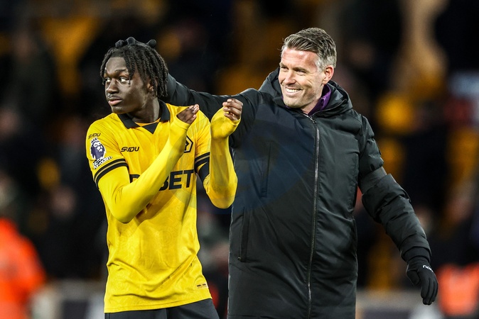 Rob Edwards manager of Wolverhampton Wanderers celebrates the win with goalscorer Mateus Mane of Wolverhampton Wanderers during the Premier League match Wolverhampton Wanderers vs West Ham United at Molineux, Wolverhampton, United Kingdom, 3rd January 2026, Credit:Ae Cosgrove/News Images / Avalon