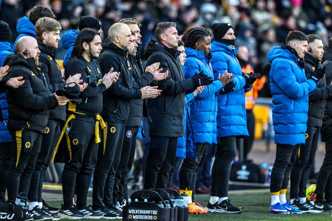 Rob Edwards manager of Wolverhampton Wanderers and his coaching staff have a minutes applaud, paying their respects to the life of former player Terry Wharton during the Premier League match Wolverhampton Wanderers vs West Ham United at Molineux, Wolverhampton, United Kingdom, 3rd January 2026, Credit:Ae Cosgrove/News Images / Avalon