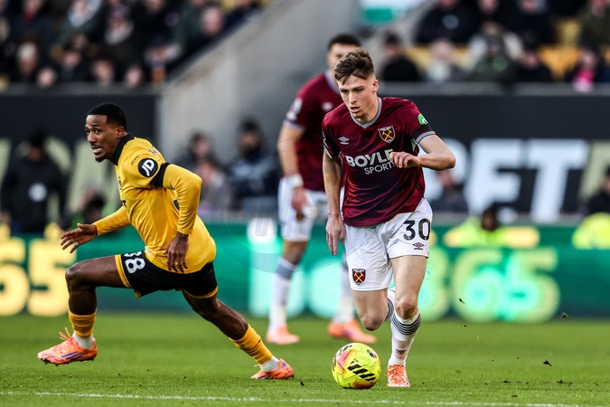 Oliver Scarles of West Ham United breaks with the ball under pressure from Jackson Tchatchoua of Wolverhampton Wanderers during the Premier League match Wolverhampton Wanderers vs West Ham United at Molineux, Wolverhampton, United Kingdom, 3rd January 2026, Credit:Ae Cosgrove/News Images / Avalon