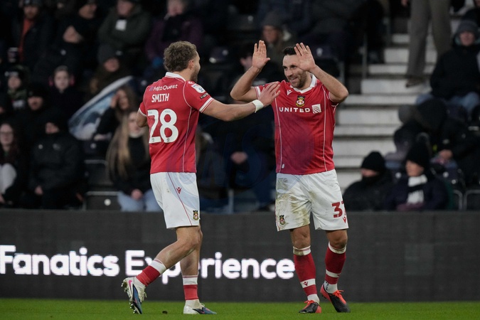 Matthew James of Wrexham celebrates his goal to make it 1-2 during the Sky Bet Championship match Derby County vs Wrexham at Pride Park Stadium, Derby, United Kingdom, 4th January 2026, Credit:Maynard Manyowa/News Images / Avalon