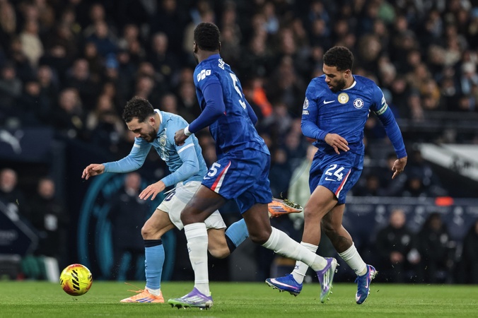 Rayan Cherki of Manchester City is fouled by Reece James of Chelsea during the Premier League match Manchester City vs Chelsea at Etihad Stadium, Manchester, United Kingdom, 4th January 2026, Credit:Mark Cosgrove/News Images / Avalon
