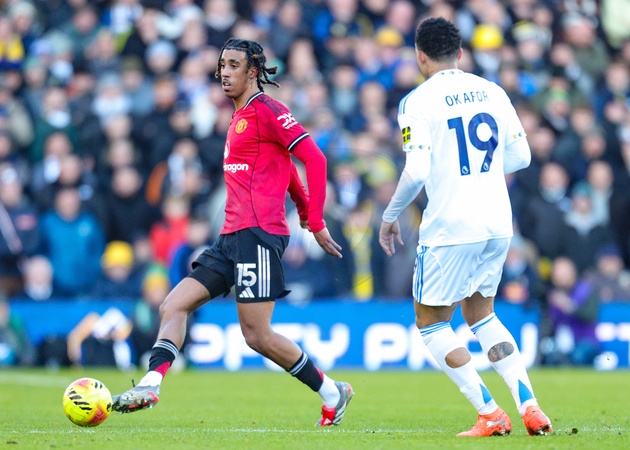 Leny Yoro of Manchester United passes the ball during the Premier League match Leeds United vs Manchester United at Elland Road, Leeds, United Kingdom, 4th January 2026, Credit:Richard Bierton/News Images / Avalon