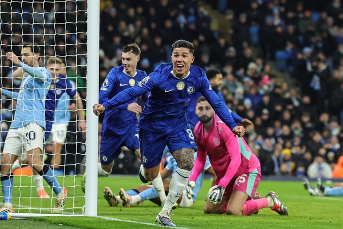 Enzo Fernandez of Chelsea celebrates his goal to make it 1-1 during the Premier League match Manchester City vs Chelsea at Etihad Stadium, Manchester, United Kingdom, 4th January 2026, Credit:Mark Cosgrove/News Images / Avalon