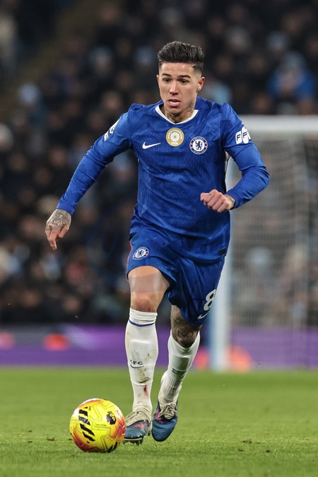 Enzo Fernandez of Chelsea breaks with the ball during the Premier League match Manchester City vs Chelsea at Etihad Stadium, Manchester, United Kingdom, 4th January 2026, Credit:Mark Cosgrove/News Images / Avalon