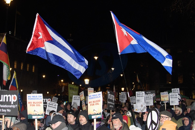 Protestors organised by Stop The War Coalition stage an emergency protest over military intervention by the US in Venezuela after capturing and deposing its leader President Nicolas Maduro in Regent Street in London, England, UK on Monday 5 January, 2026 as they march to Parliament Square., Credit:Justin Ng / Avalon