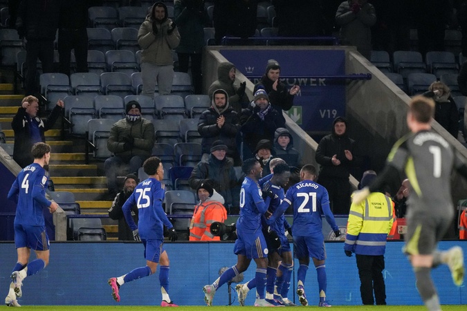 Abdul Fatawu of Leicester City celebrates his goal to make it 2-1 during the Sky Bet Championship match Leicester City vs West Bromwich Albion at King Power Stadium, Leicester, United Kingdom, 5th January 2026, Credit:Maynard Manyowa/News Images / Avalon