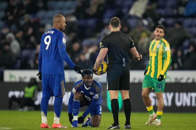 Referee Stephen Martin speaks to players during the Sky Bet Championship match Leicester City vs West Bromwich Albion at King Power Stadium, Leicester, United Kingdom, 5th January 2026, Credit:Maynard Manyowa/News Images / Avalon
