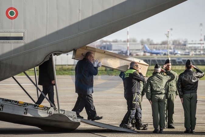 05/01/2025 Milan, Linate Military Airport, arrival of state plane with the coffins of four victims of the New Year's Eve tragedy at the Le Constellation club in Crans-Montana, Credit:Nicola Marfisi / Avalon