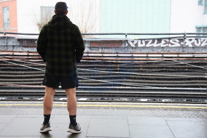 A man in shorts watches snow fall at Kilburn Station in Kilburn, London, England, UK on Tuesday 6 January, 2026 as a cold snap hits., Credit:Justin Ng / Avalon