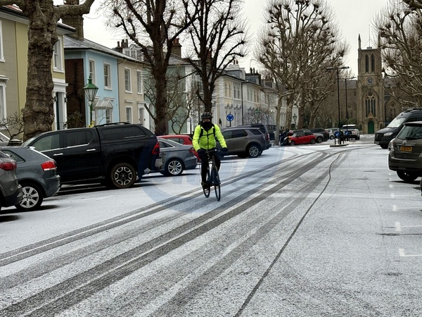 London, UK. 6 January 2026. Visitors walk through Holland Park on a cold winter afternoon after snowfall earlier in the day, with frost and compacted snow remaining on roads and pavements. Pedestrians, cyclists and delivery riders make their way through the park and surrounding streets in west London as temperatures remain low., Credit:Alexander Seale / Avalon