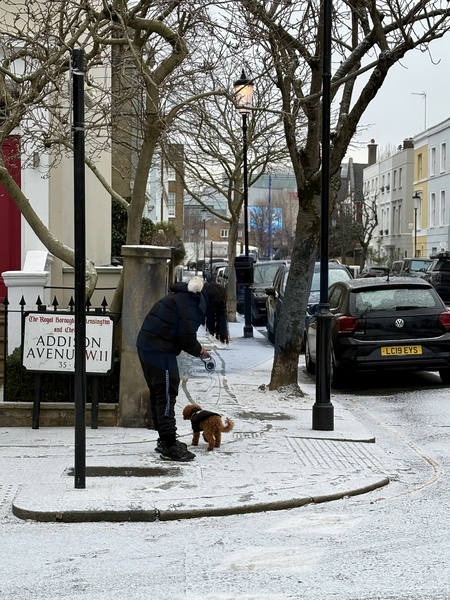London, UK. 6 January 2026. Visitors walk through Holland Park on a cold winter afternoon after snowfall earlier in the day, with frost and compacted snow remaining on roads and pavements. Pedestrians, cyclists and delivery riders make their way through the park and surrounding streets in west London as temperatures remain low., Credit:Alexander Seale / Avalon