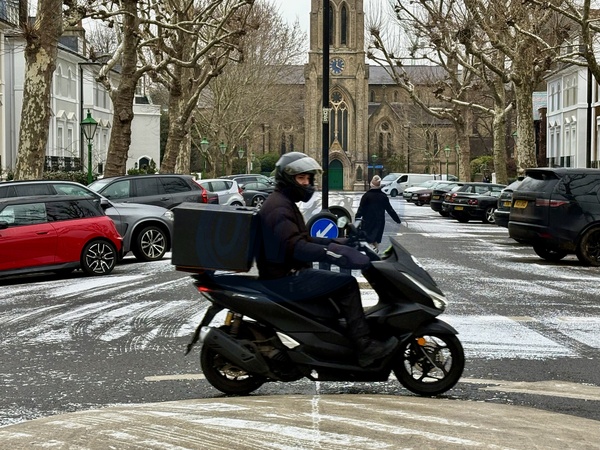 London, UK. 6 January 2026. Visitors walk through Holland Park on a cold winter afternoon after snowfall earlier in the day, with frost and compacted snow remaining on roads and pavements. Pedestrians, cyclists and delivery riders make their way through the park and surrounding streets in west London as temperatures remain low., Credit:Alexander Seale / Avalon