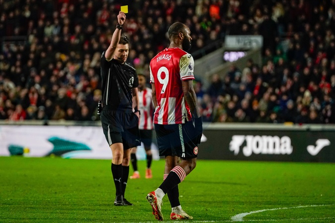 Referee Matthew Donohue gives a yellow card to Trai Hume of Sunderland during the Premier League match Brentford vs Sunderland at The Gtech Community Stadium, London, United Kingdom, 7th January 2026, Credit:Maynard Manyowa/News Images / Avalon