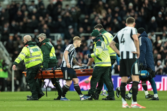 Lewis Hall of Newcastle Untied checks on team mate Fabian Schar as he's stretchered off during the Premier League match Newcastle United vs Leeds United at St. James's Park, Newcastle, United Kingdom, 7th January 2026, Credit:Mark Cosgrove/News Images / Avalon