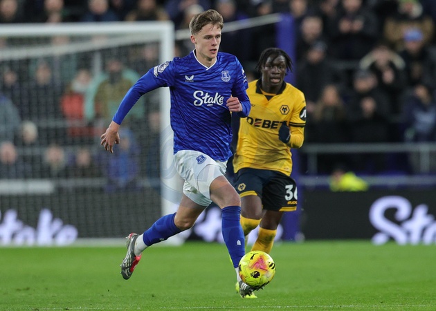 Harrison Armstrong of Everton breaks with the ball during the Premier League match Everton vs Wolverhampton Wanderers at Hill Dickinson Stadium, Liverpool, United Kingdom, 7th January 2026, Credit:Richard Bierton/News Images / Avalon