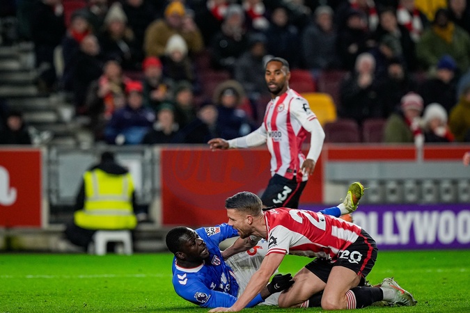 Kristoffer Ajer of Brentford brings down Brian Brobbey of Sunderland to conceded a penalty during the Premier League match Brentford vs Sunderland at The Gtech Community Stadium, London, United Kingdom, 7th January 2026, Credit:Maynard Manyowa/News Images / Avalon