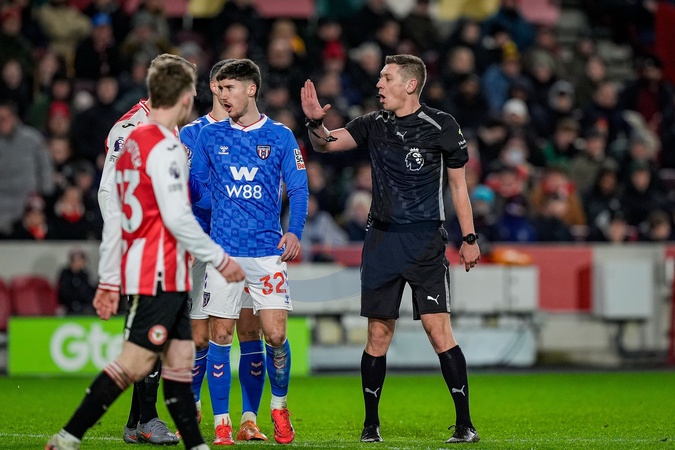 Referee Matthew Donohue speaks to Brentforrd players after awarding a penalty for Sunderland during the Premier League match Brentford vs Sunderland at The Gtech Community Stadium, London, United Kingdom, 7th January 2026, Credit:Maynard Manyowa/News Images / Avalon