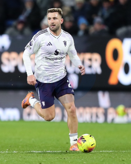 Luke Shaw of Manchester United with ball at his feet during the Premier League match Burnley vs Manchester United at Turf Moor, Burnley, United Kingdom, 7th January 2026, Credit:Jorge Horsted/News Images / Avalon