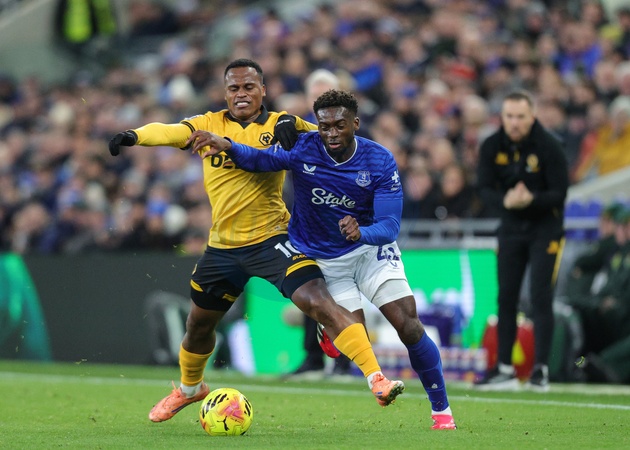 Jhon Arias of Wolverhampton Wanderers and Tim Iroegbunam of Everton battle for the ball during the Premier League match Everton vs Wolverhampton Wanderers at Hill Dickinson Stadium, Liverpool, United Kingdom, 7th January 2026, Credit:Richard Bierton/News Images / Avalon