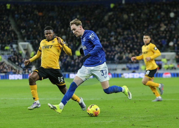 James Garner of Everton in action during the Premier League match Everton vs Wolverhampton Wanderers at Hill Dickinson Stadium, Liverpool, United Kingdom, 7th January 2026, Credit:Richard Bierton/News Images / Avalon