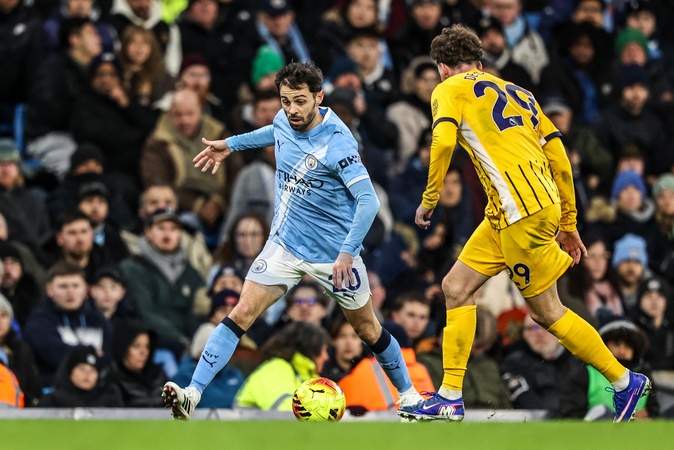 Bernardo Silva of Manchester City breaks with the ball under pressure from Maxim De Cuyper of Brighton & Hove Albion during the Premier League match Manchester City vs Brighton and Hove Albion at Etihad Stadium, Manchester, United Kingdom, 7th January 2026, Credit:Ae Cosgrove/News Images / Avalon