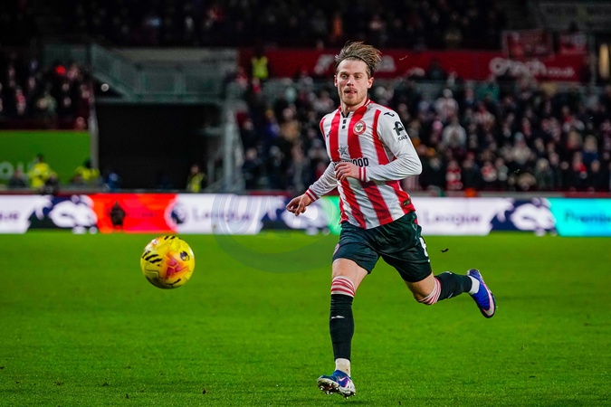 Mathias Jensen of Brentford makes a run with the ball during the Premier League match Brentford vs Sunderland at The Gtech Community Stadium, London, United Kingdom, 7th January 2026, Credit:Maynard Manyowa/News Images / Avalon