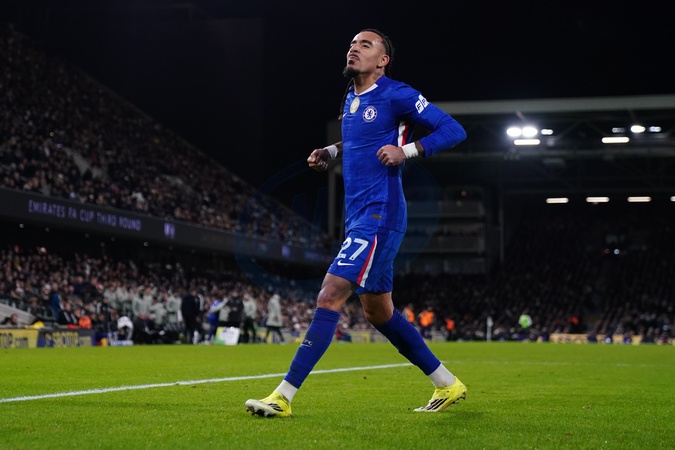 Malo Gusto of Chelsea celebrates equaliser during the Premier League match Fulham vs Chelsea at Craven Cottage, London, United Kingdom, 7th January 2026, Credit:Harvey Murphy/News Images / Avalon